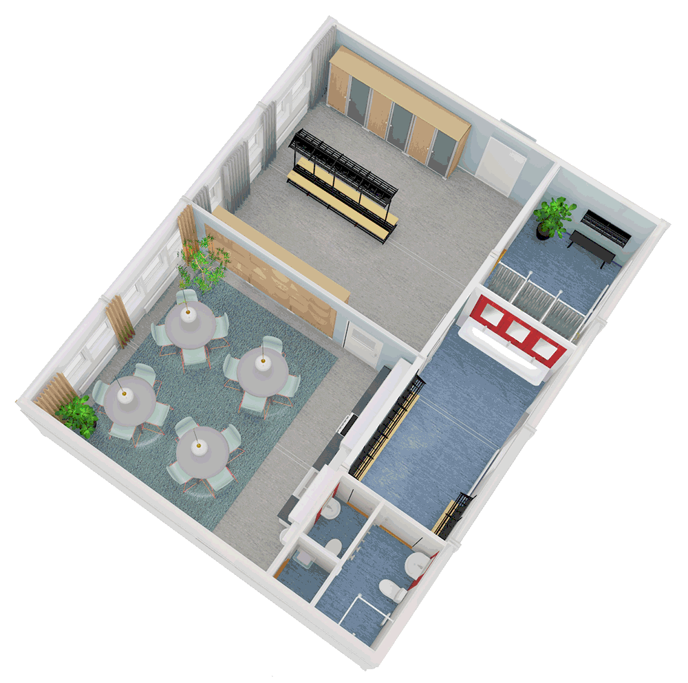 - Kan enkelt kompletteras med exempelvis fler omklädningsrum eller större pausrum