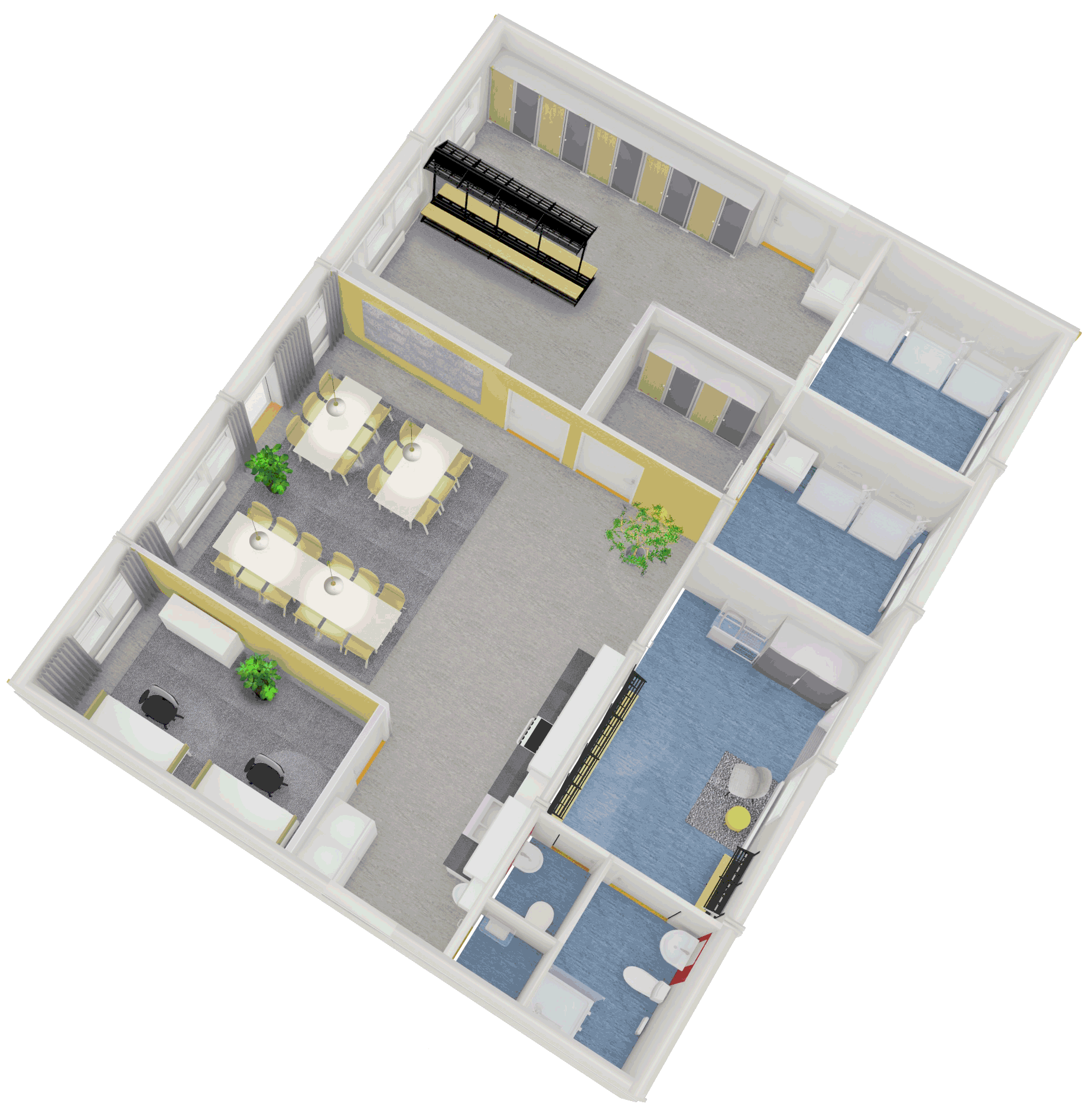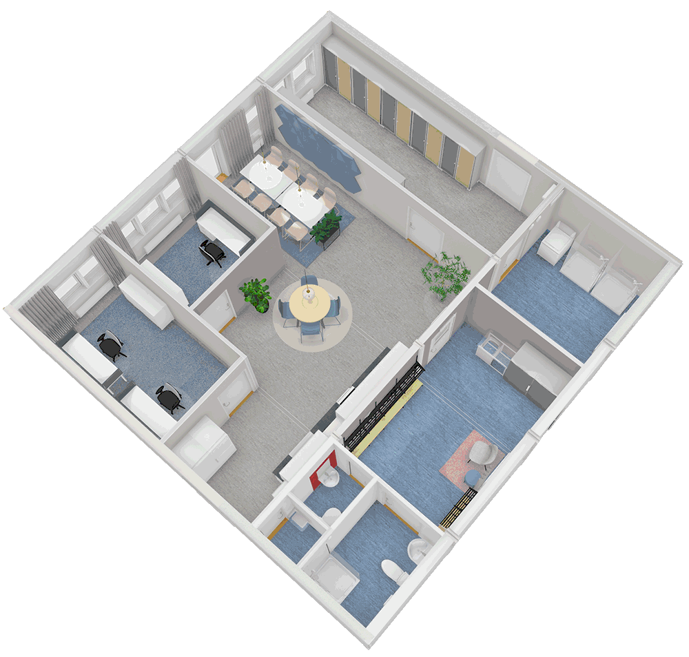 Våra moduler kan byggas ihop till kompletta personalutrymmen med allt från hygienutrymmen till kontor och gemensamhetsytor. Här är några populära kombinationer: